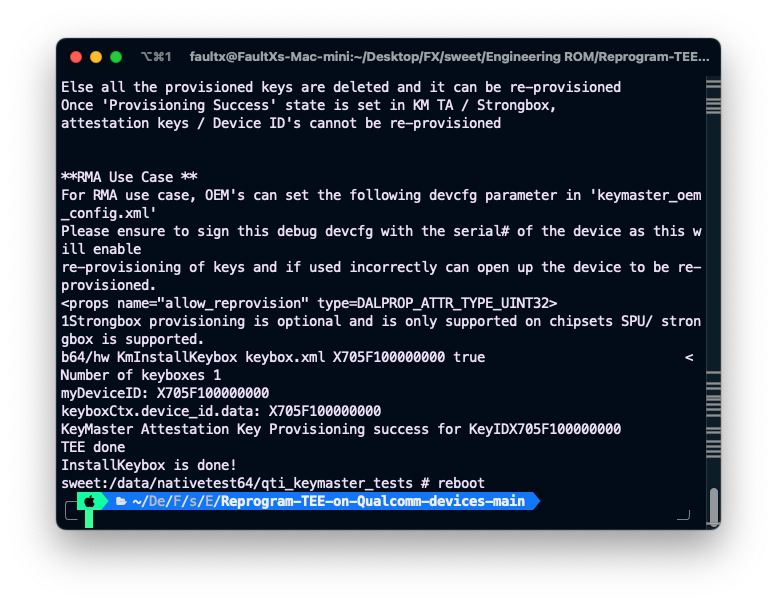 adb rootadb remountadb rebootadb shell mkdir -p /data/nativetest64/qti_keymaster_tests/adb push sw.xml /data/nativetest64/qti_keymaster_tests/adb shell LD_LIBRARY_PATH=/vendor/lib64/hw KmInstallKeybox /data/nativetest64/qti_keymaster_tests/sw.xml sw true - If the message says: