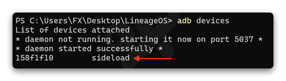 Apply update➜Apply from ADB - Cek untuk memastikan ADB Sideload terdeteksi di komputer: